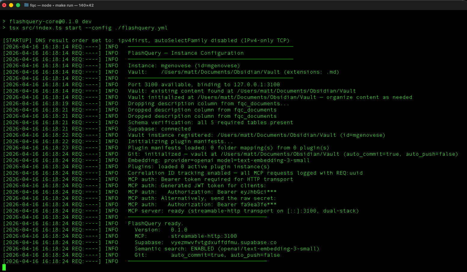 Stand up FlashQuery on a VPS or personal Supabase project you control. Same vault, same plugins, reachable from every machine. Nothing hosted by FlashQuery.